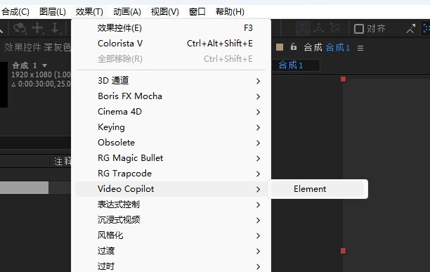 4打开AE,新建一个图层,在顶部菜单,效果 - VideoCopilot - Element,使用插件,会有弹窗出来