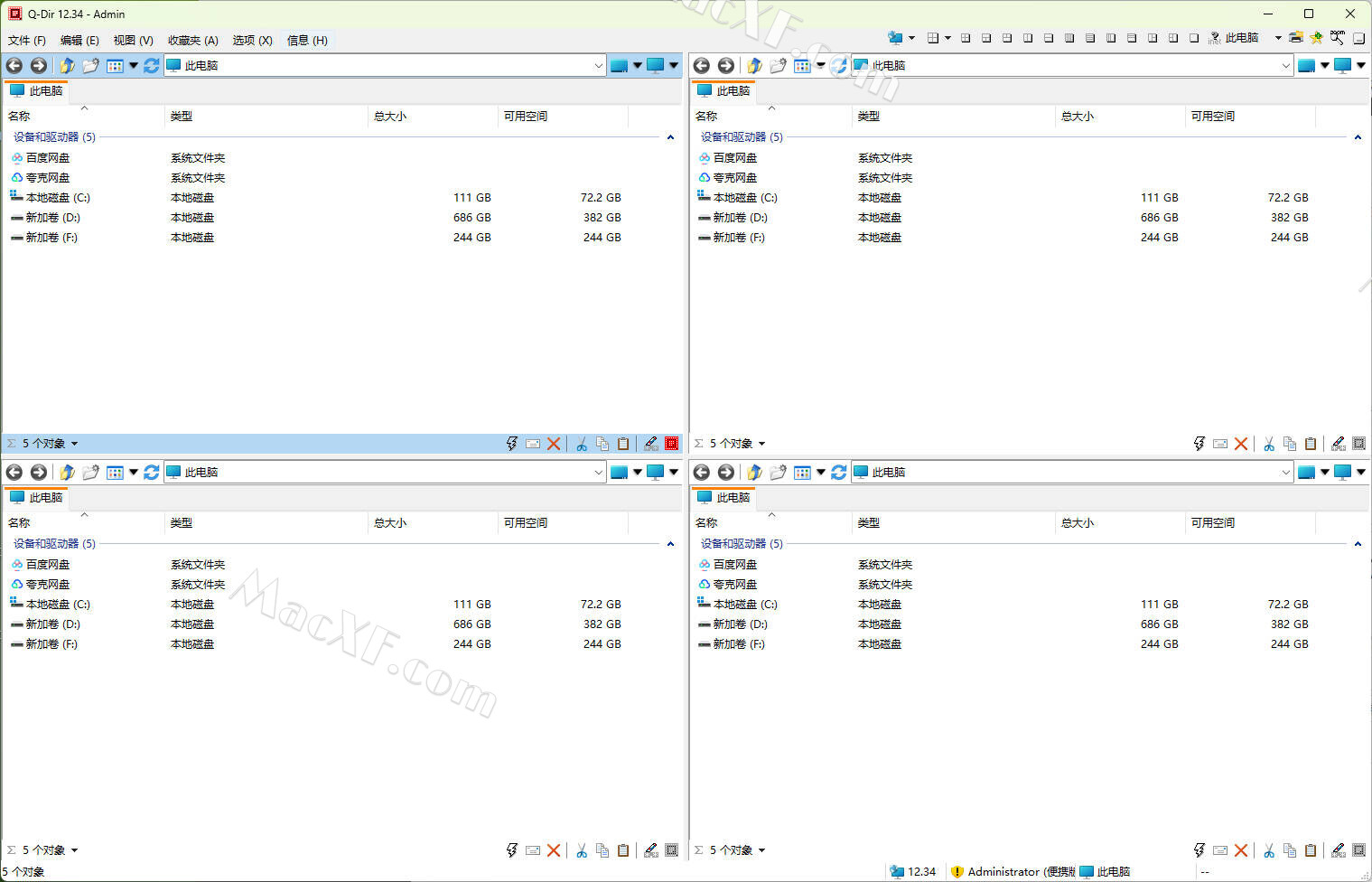 分屏操作:Q-Dir支持最多四个不同的文件夹分别显示在一个窗口中,使得您能够更方便地进行文件管理操作。