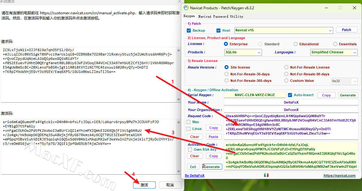 15复制"请求码"到注册机,点击“Generate”,复制激活码到对应框中,点击"激活",如下图所示;