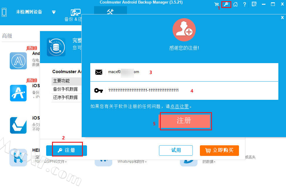 10点击小钥匙图标,点击注册按钮,弹出注册框,输入任意邮箱,输入注册码:1111111111111111111111-11111111111111111,点击注册