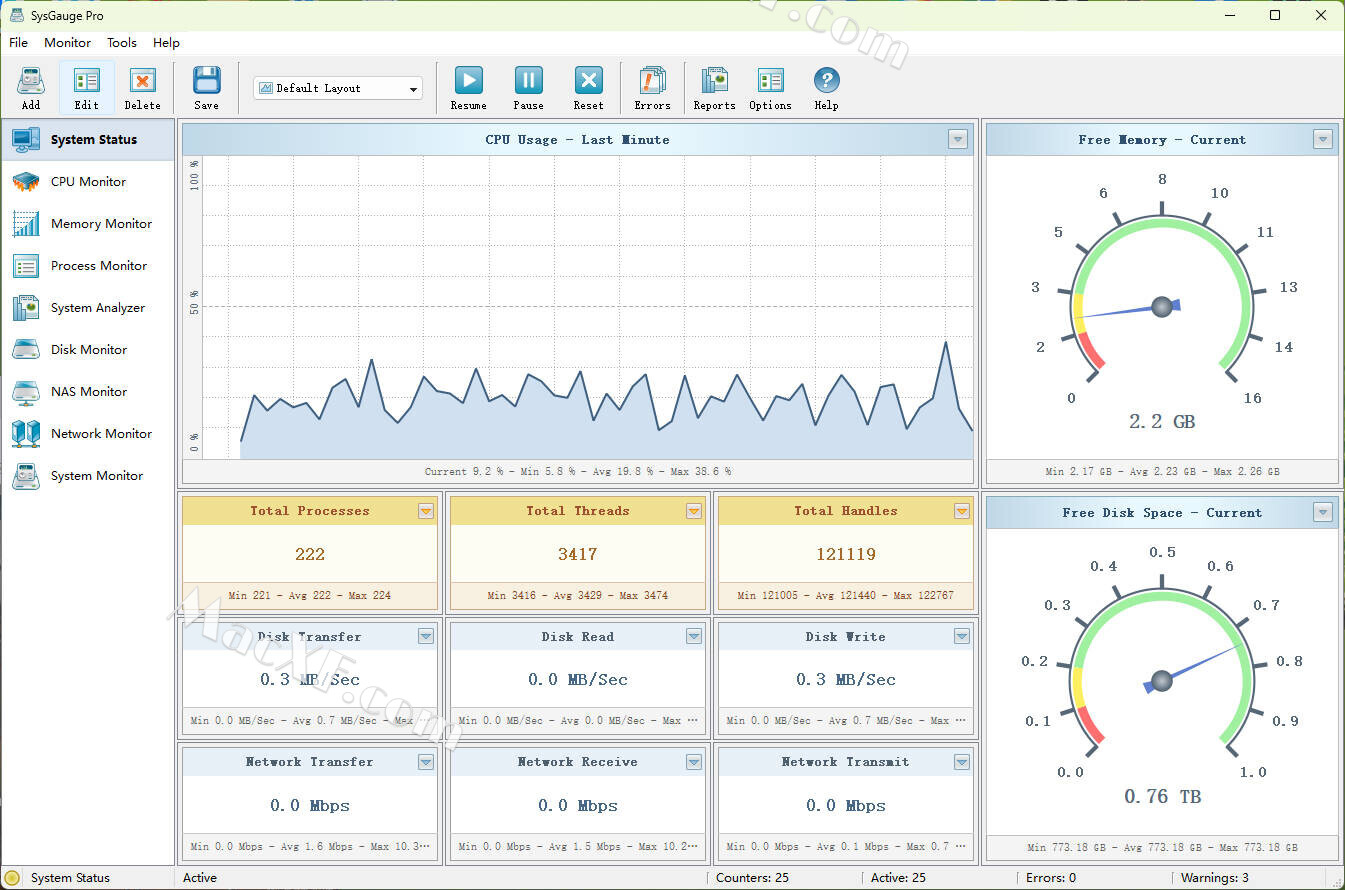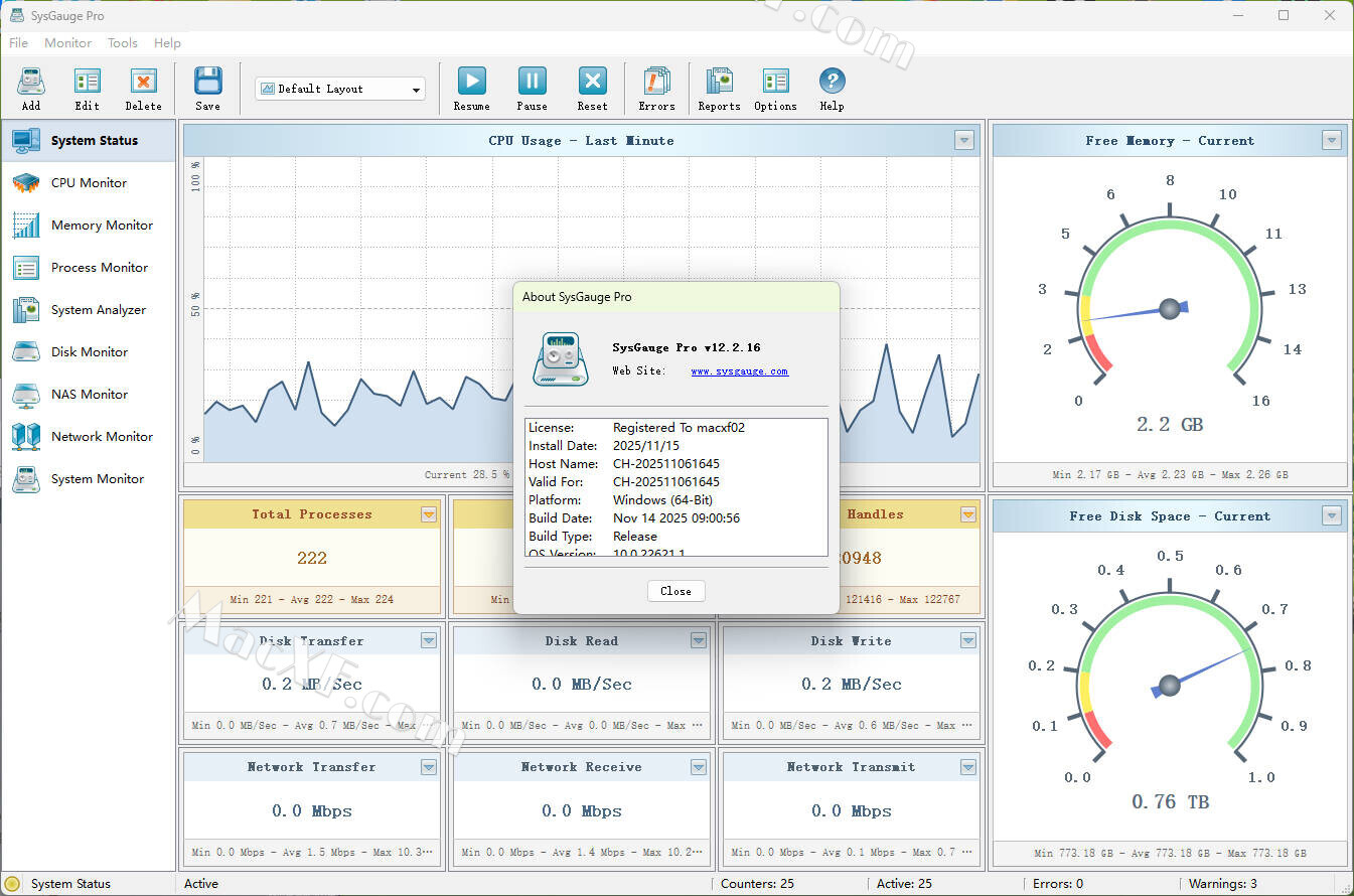 实时性能监测:SysGauge能够实时监测计算机的CPU使用率、内存使用情况、磁盘活动、网络流量等信息,用户可以随时了解计算机的运行状况。