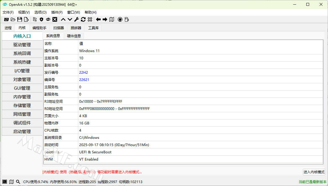 - 内核:系统内核工具,例如:驱动、回调、过滤器、IDT/SDT WFP等功能,以后会支持更多。