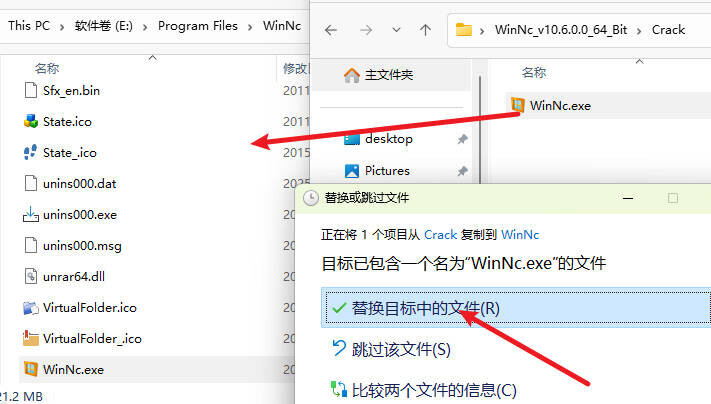 10将破解补丁复制粘贴到软件目录中并点击替换文件,该目录默认为:C:\Program Files\WinNc