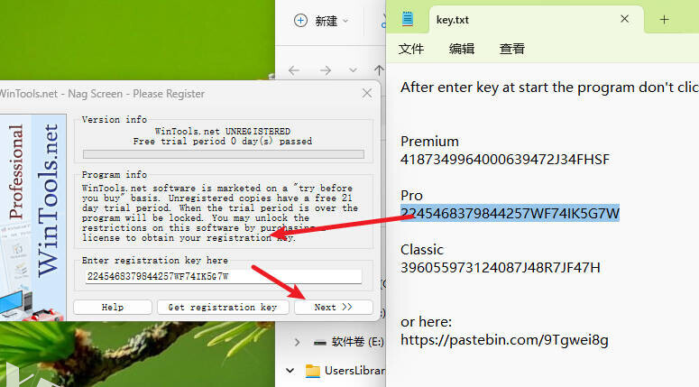 11打开软件,弹出注册框,返回安装包,打开注册码文档,根据软件版本,将对应的注册码复制到注册框内,点击Next即可完成破解