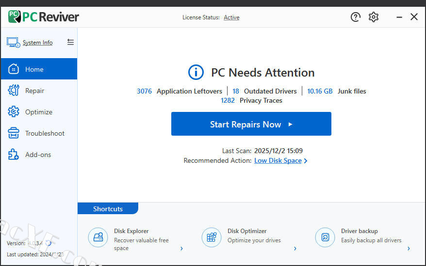 PC Reviver 是一款多功能实用程序,可诊断您的 PC 上的错误、安全地修复它们,并提供其他维护和优化建议。PC Reviver 是一种值得信赖和推荐的方法,可以恢复您的 PC 的最佳性能和稳定性。