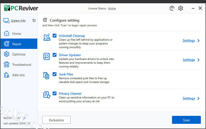PC Reviver 包括高级诊断工具,可以执行全面和完整的扫描以查找您的 PC 的问题。PC Reviver 将安全地修复这些问题并执行其他优化,以恢复您的 PC 的最佳性能和稳定性。