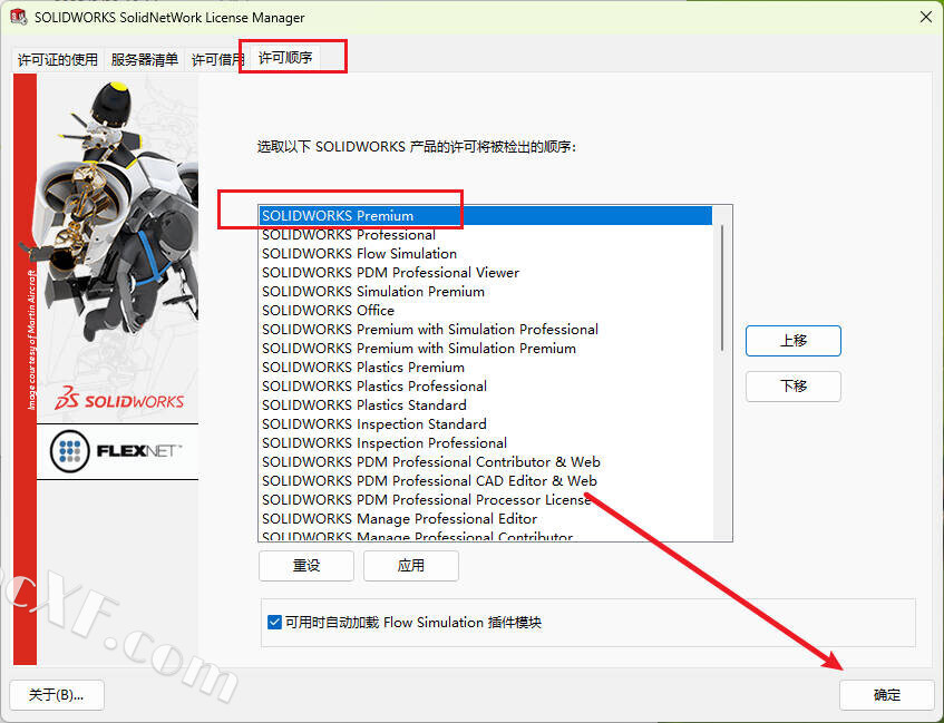 18运行SolidNetWork许可证管理器>许可证顺序。使用“上移”和“下移”按钮将同名的Premium产品置于Professional和Standard产品之上。点击应用并确定,重新启动SolidWorks