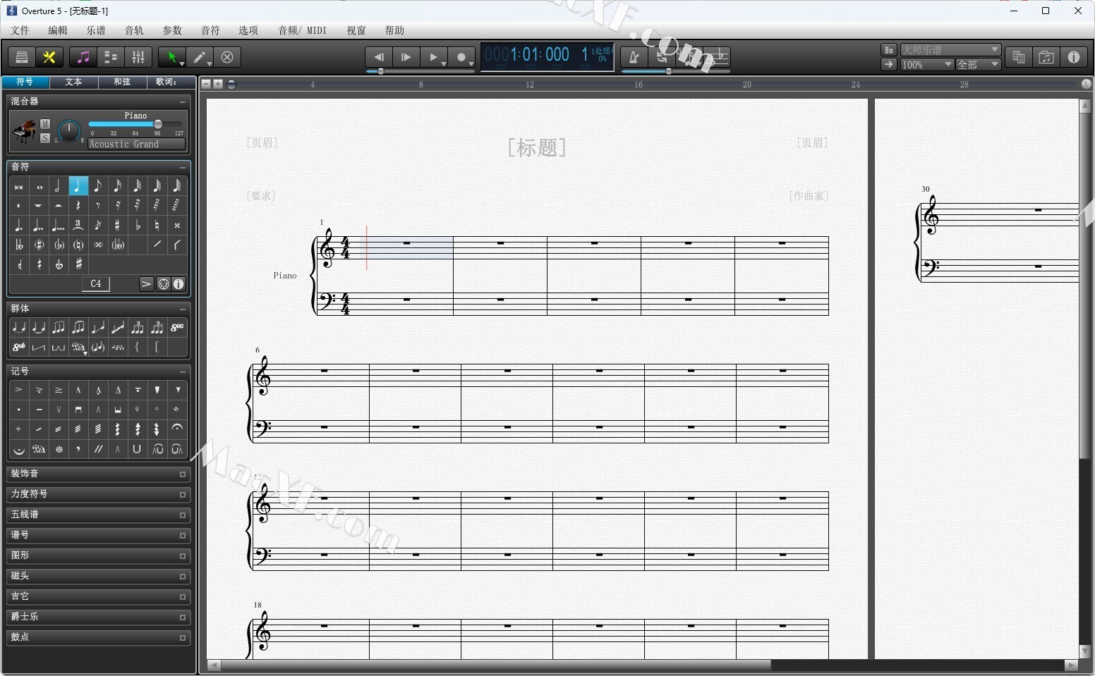 Overture是一套专业级的五线谱编辑、制作、印谱软件它易于上手,功能强大,简洁清晰的用户界面保证了其效率和易用性。Overture 是第一个使用钢琴卷帘和连续数据编辑器进行 MIDI 数据编辑的乐谱程序。本站为您提供Overture 5破解版的下载,需要的朋友欢迎下载使用!