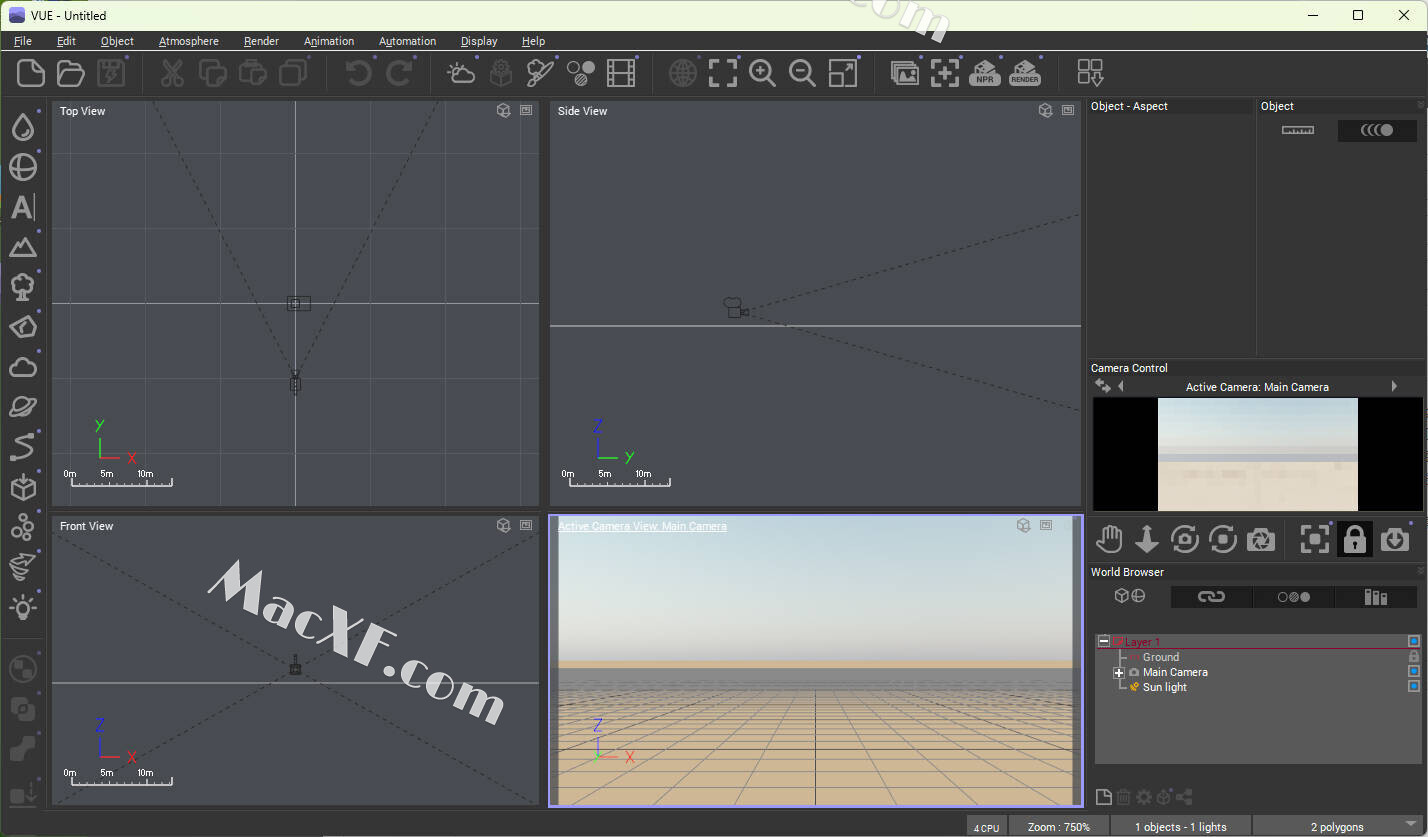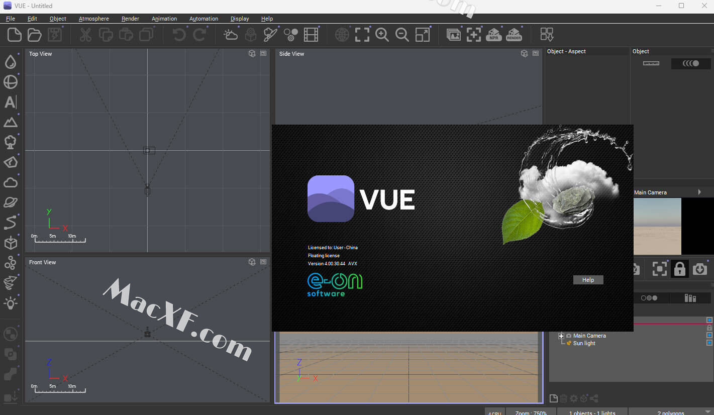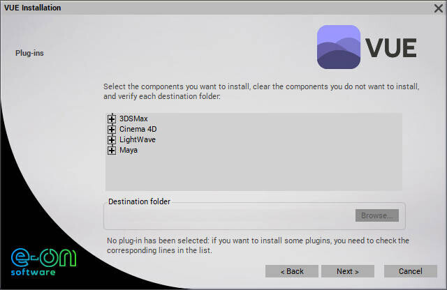 能与主流三维软件协同工作: 例如与3DSMax、Cinema4D、LightWave、Maya、XSI、Poser、Vray等其它主流的3D软件进行很好地协同工作(以插件方式和其它三维软件衔接时,多以独立菜单的形式出现,足见对Vue的重视程度),实现“强强联合”、“黄金组合”。在实际工作中,我们可以用3DSMax或Cinema4D制作人文景观或建筑模型,而用Vue制作自然环境,这样可以轻松创建“全模型”的园林景观效果或室外效果。
