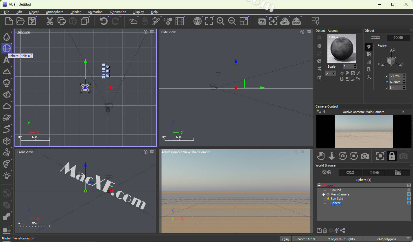 在景观动画、室外动画方面优势明显: 例如植物微风动画、材质动画、地形变形动画、云层和大气动画、生态系统动画…,这些景观动画如果纯粹使用3DSMax或Cinema4D制作,非常烦琐、低效(甚至是不可能),而用Vue则给创作者带来轻松、享受的感觉。