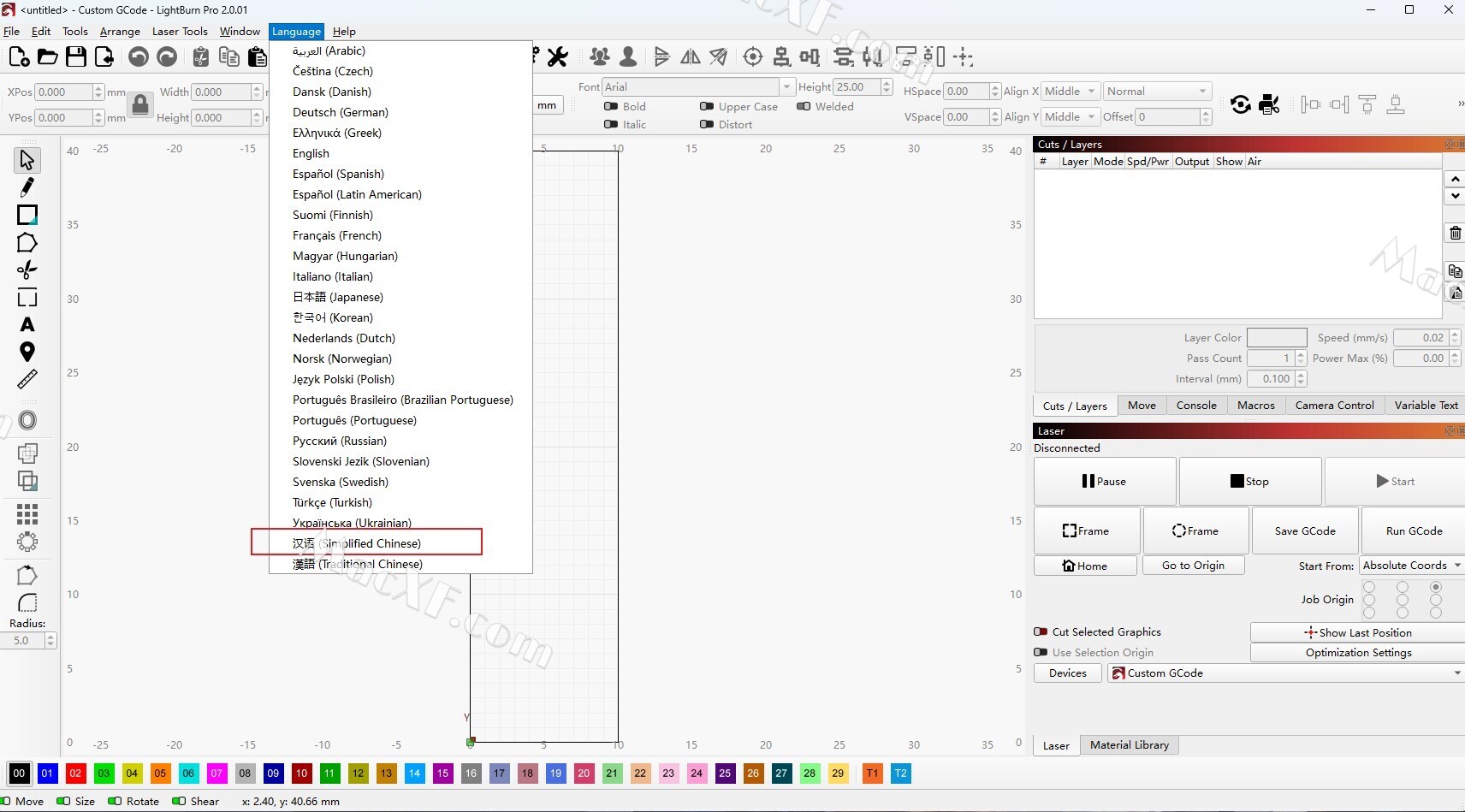 我们目前支持大多数基于Ruida,Trocen,TopWisdom和GCode的控制器。受支持的GCode控制器,包括Grbl,Smoothieware,Grbl-LPC和Marlin。受支持的Ruida控制器包括RDC6442G/S,RDC6445G,RDC6332G,RDLC-320A和R5-DSP。受支持的Trocen控制器包括AWC708C,AWC608和TL-3120。即将添加更多的控制器,因此,如果您没有看到列出的控制器,请向我们发送消息-也许我们已经在努力!