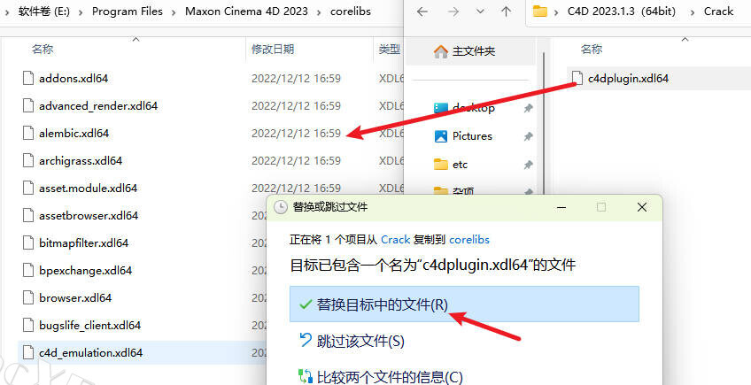 7打开软件所在位置,将破解文件夹crack中的补丁,复制到软件安装目录,并替换(默认目录C:\Program Files\Maxon Cinema 4D 2023\corelibs)。