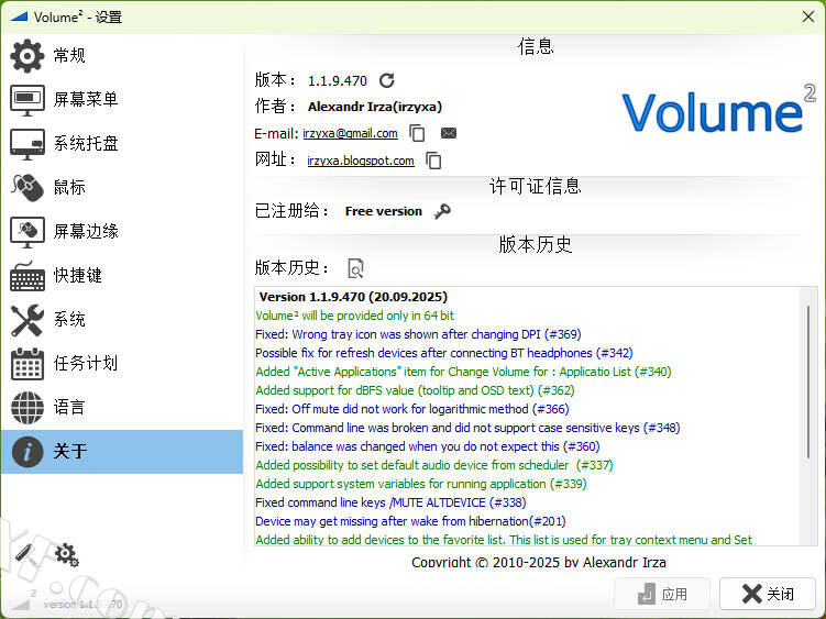 Volume² 是一个完全免费且功能强大的实用应用组件,它旨在完美取代 Windows 标准音量控制器。 也可以理解为Windows系统音量控制的高级版本。使用 Volume² 时,用户只需简单转动鼠标滚轮,或轻松按下键盘热键/快捷键,将鼠标指针移至屏幕边缘即可轻松调节音量。Volume² 还包括许多具有高级音量控制支持、计划任务程序、屏幕显示和命令行操作支持的混音器,还可以通过在操作系统 Preset 中单击鼠标或热键来存储和调用不同的场景。
