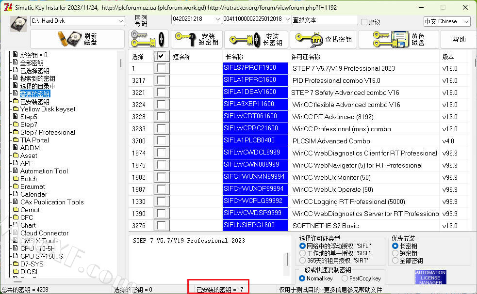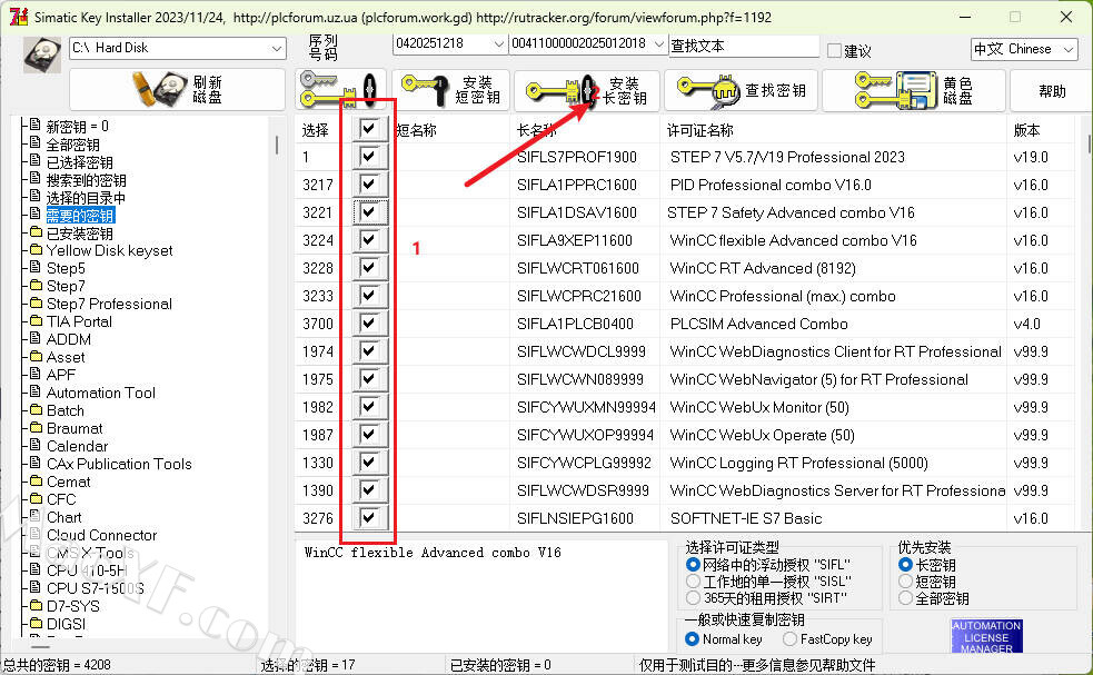 8运行破解文件夹中的Sim_EKB_Install.exe,在软件左侧选择你安装的TIA Portal组件,右边选择点击安装长密匙。