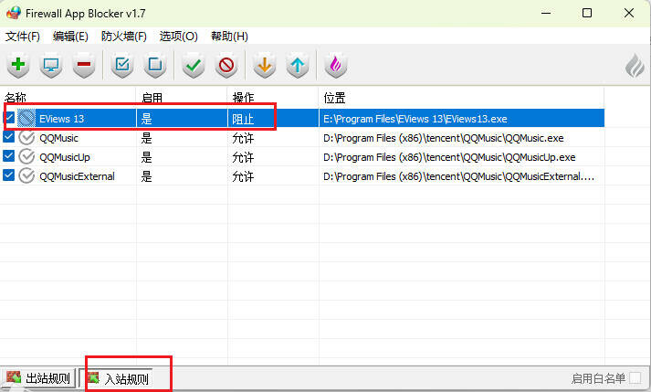 15点击入站规则,将桌面EViews 13图标拖到软件中。