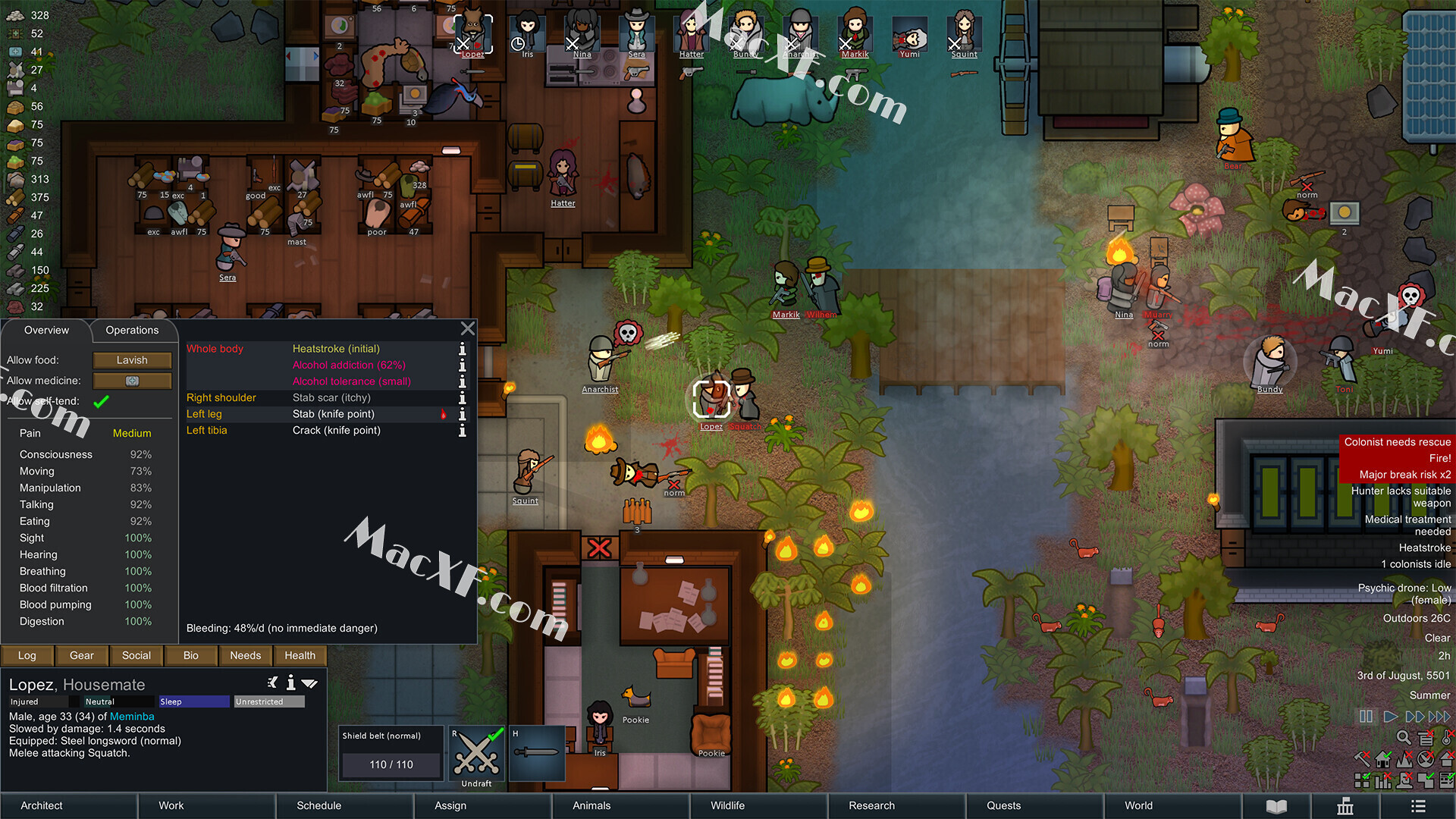 每个身体部位的伤口、感染、修复和慢性病都可以被跟踪,并影响角色的能力。眼睛受伤会对射击或做手术造成困难。双腿受伤使人移动缓慢。手、脑、口、心、肝、肾、胃、脚、手指、脚趾等部位都可能受伤、患病或缺失,并且所有都具有合理的游戏内效果。其他物种都有自己专属的身体布局— 摘下鹿的一条腿,它仍然可以用其他三条腿蹒跚而行。摘下犀牛的角,它的危险性就会降低很多。