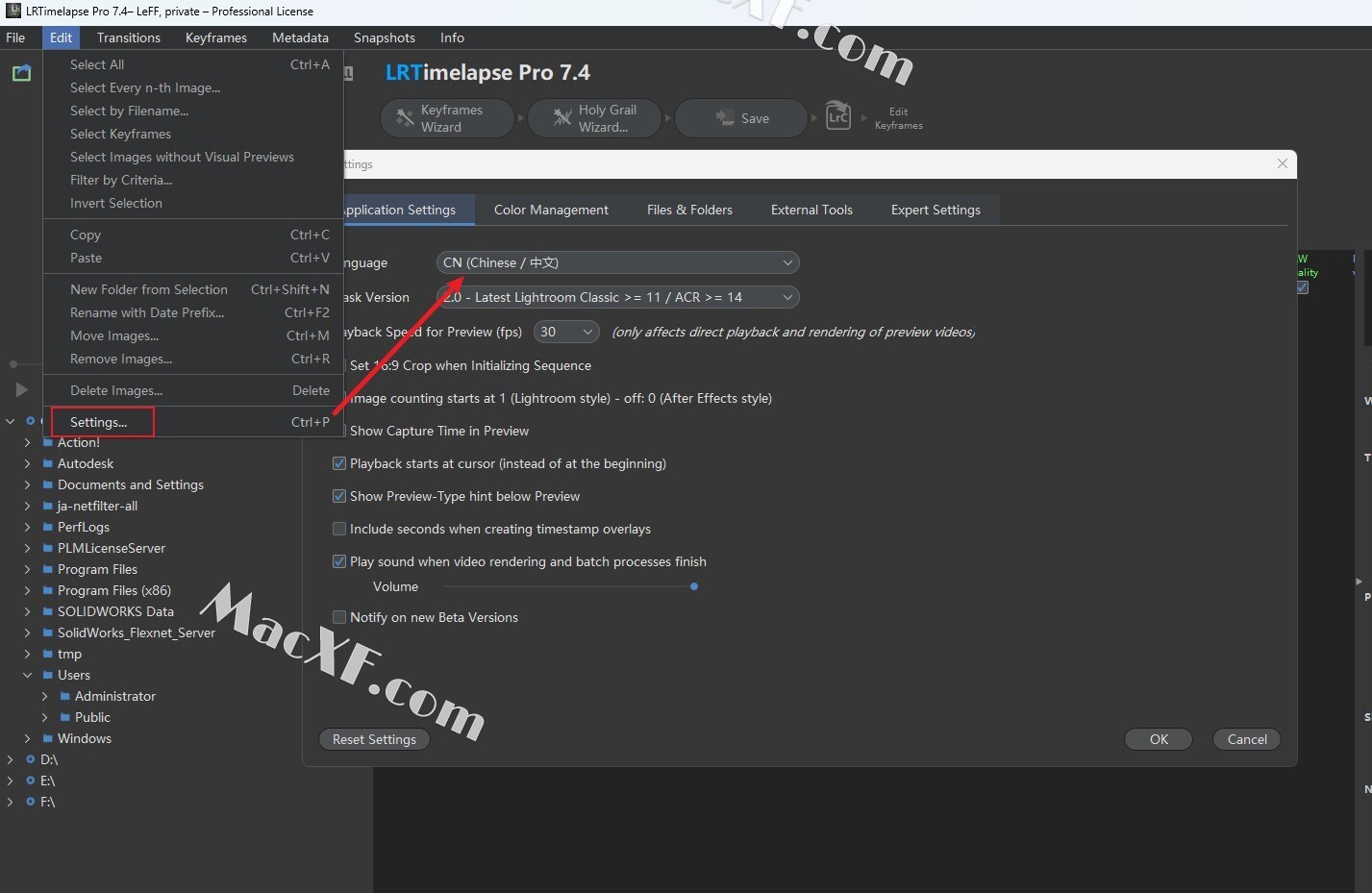 5打开软件,依次点击 菜单栏 Edit→Settings→Application Settings→Language→CN(Chinese/中文)→OK→确定,重启后就是中文版了