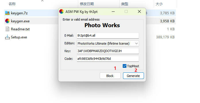 7解压并运行注册机(keygen),点击“Block(屏蔽)”按钮