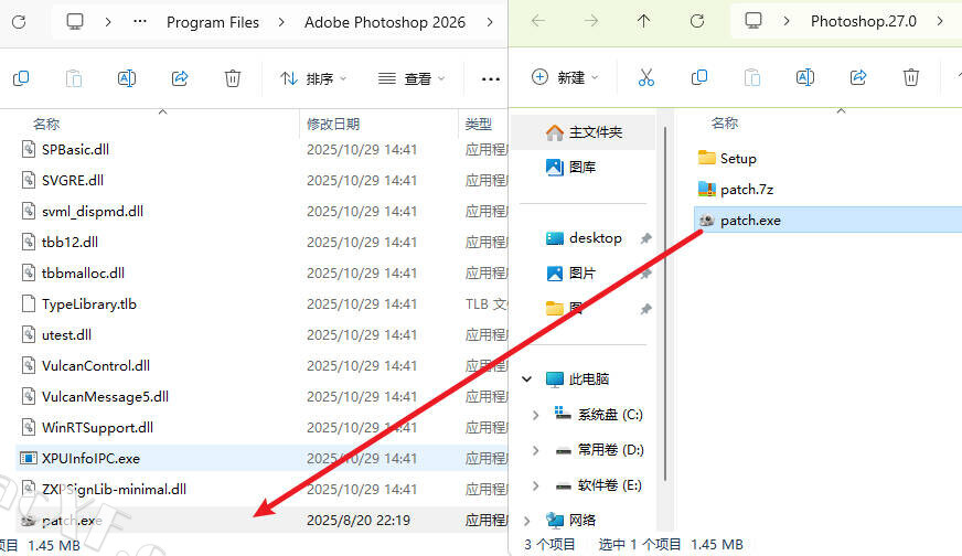 2打开文件所在位置,默认目录为C:\Program Files\Adobe Photoshop 2026回到安装包解压patch,将patch复制进软件安装目录中,