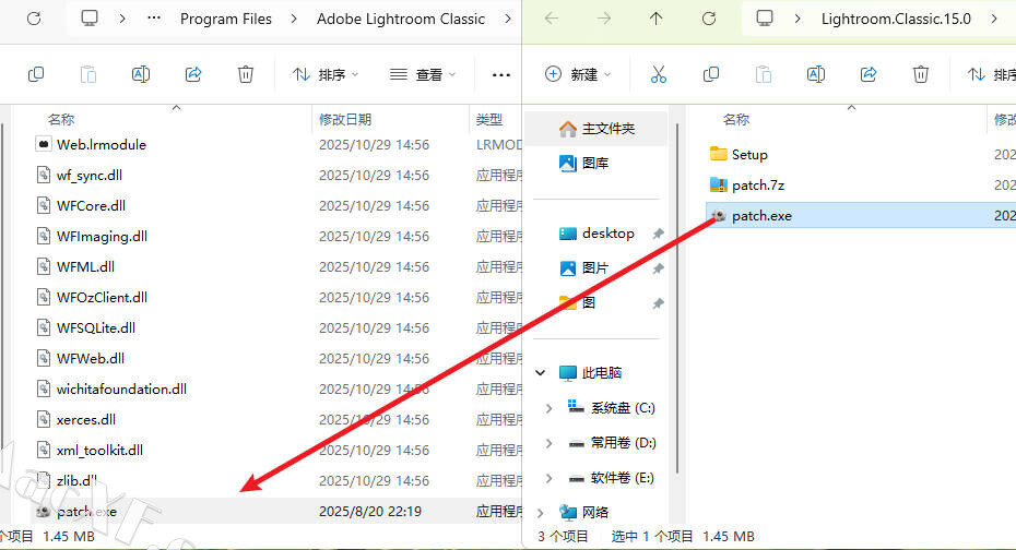 2打开文件所在位置,默认目录为C:\Program Files\Adobe Lightroom Classic回到安装包解压patch,将patch复制进软件安装目录中,