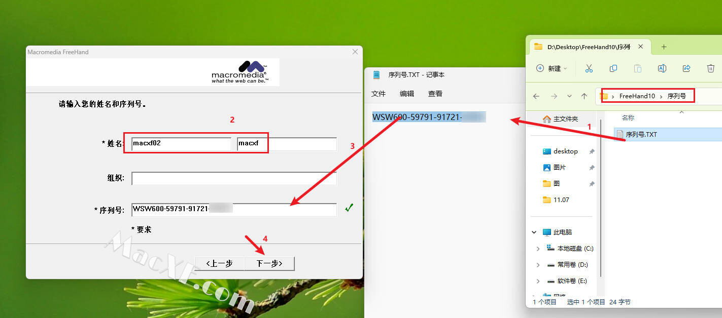 3此时需要填写序列号,返回安装包打开序列号文件夹中的序列号.TXT,将序列号复制至窗口,姓名和组织可任意填写,然后可以看到序列号已成功,点击“下一步”即可